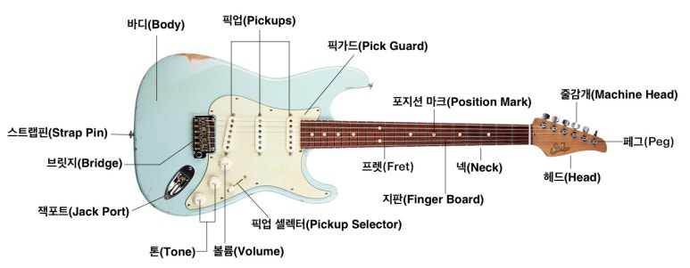 기타의 구조는 다양한 부품으로 이루어져 있으며, 각각 고유한 명칭과 역할을 가지고 있습니다. 아래는 기타의 주요 부품과 그 명칭입니다: